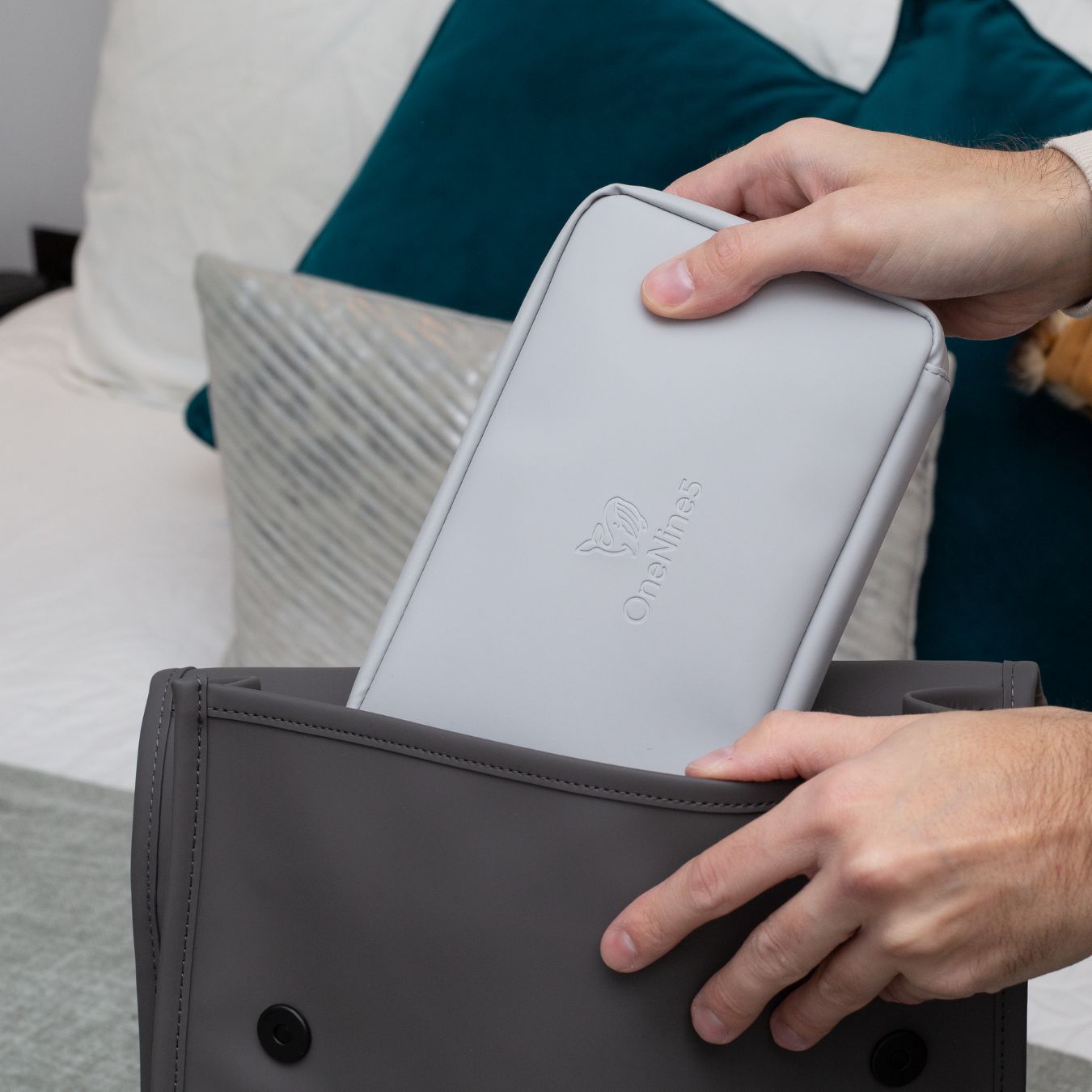 A female packing the Komodo Pink Essentials Pouch into a grey bag, on a bed.