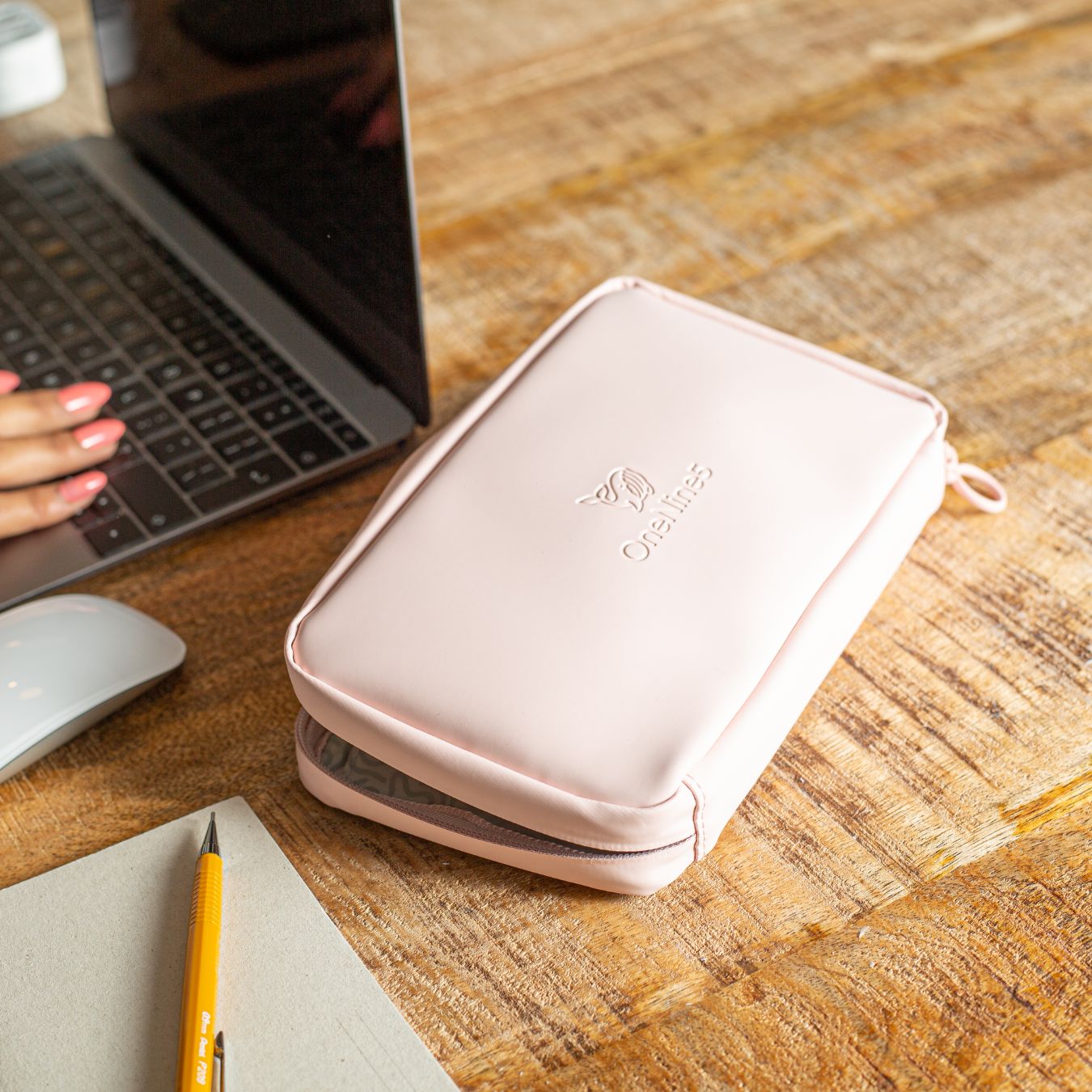 A birdseye view of the Komodo Pink Eco Essentials Pouch zipped up and laid flat on a brown wooden desk. A female is working on an Apple Macbook and using an Apple Mouse, with a small grey notebook and and yellow pencil to the left of her