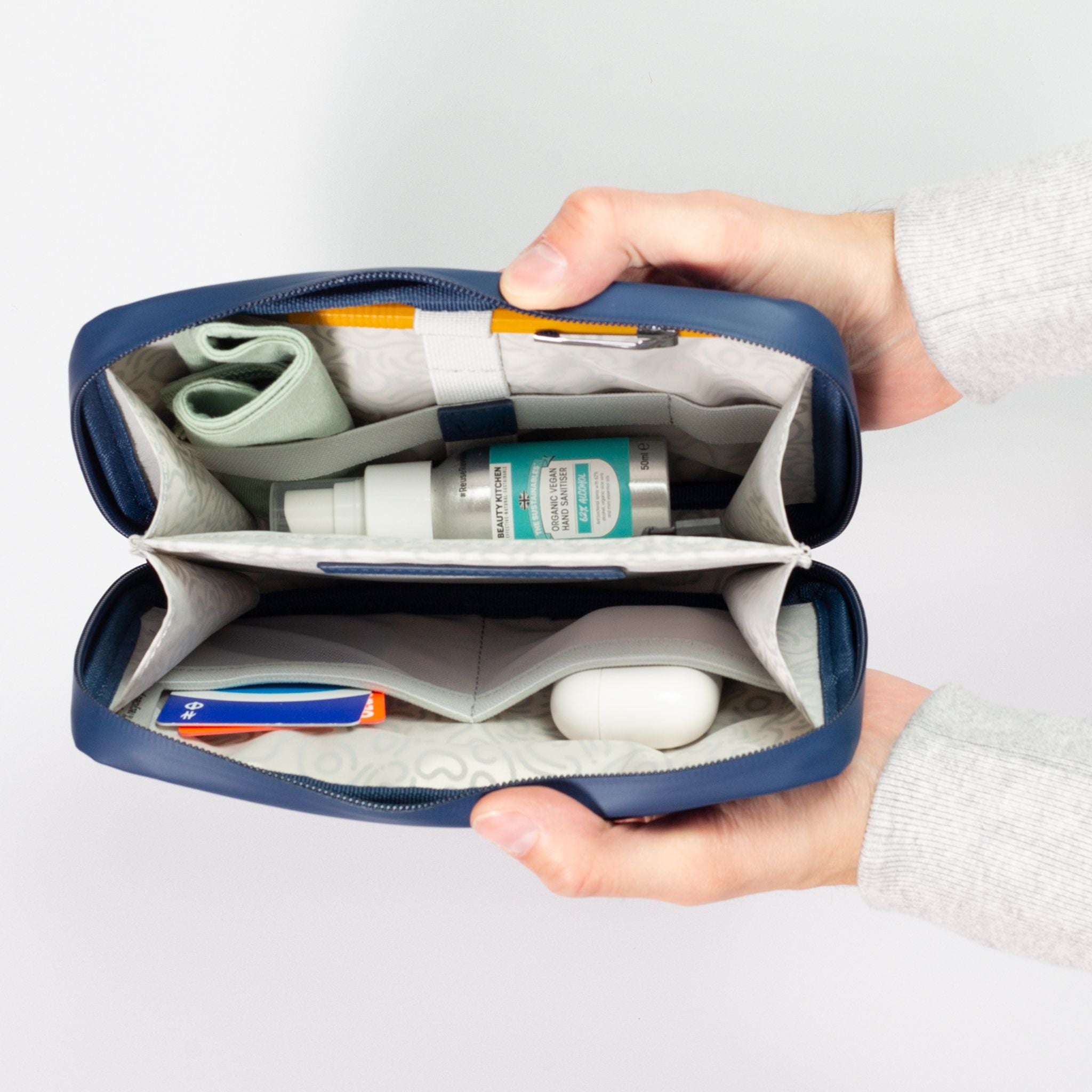 A dedicated home for the small essentials and valuables that usually end up lost at the bottom of a bag. The wide clamshell opening, mesh pockets and elastic loops mean everything has a place - and stays there, whether you're heading to the office or the departure gate.